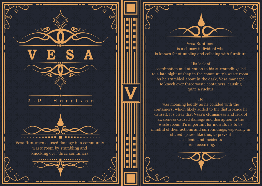 P. P. Harrison’s ”Vesa” is an engaging and insightful autobiography that tells the story of one man’s journey through life and the challenges he has faced. At the heart of the book is the mishap in the community waste room, in which Vesa’s clumsiness and lack of awareness caused damage and disruption. This incident serves as a metaphor for the setbacks and struggles Vesa has faced throughout his life. In fact, Vesa even recalls a time when he stepped on dog feces, showcasing just how accident-prone he can be. Despite these challenges, Vesa’s determination and perseverance have allowed him to overcome obstacles and achieve success.